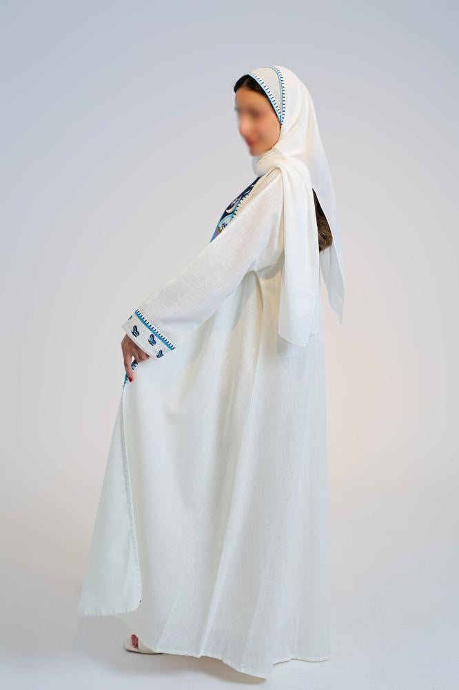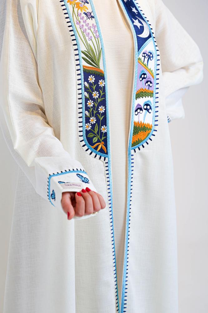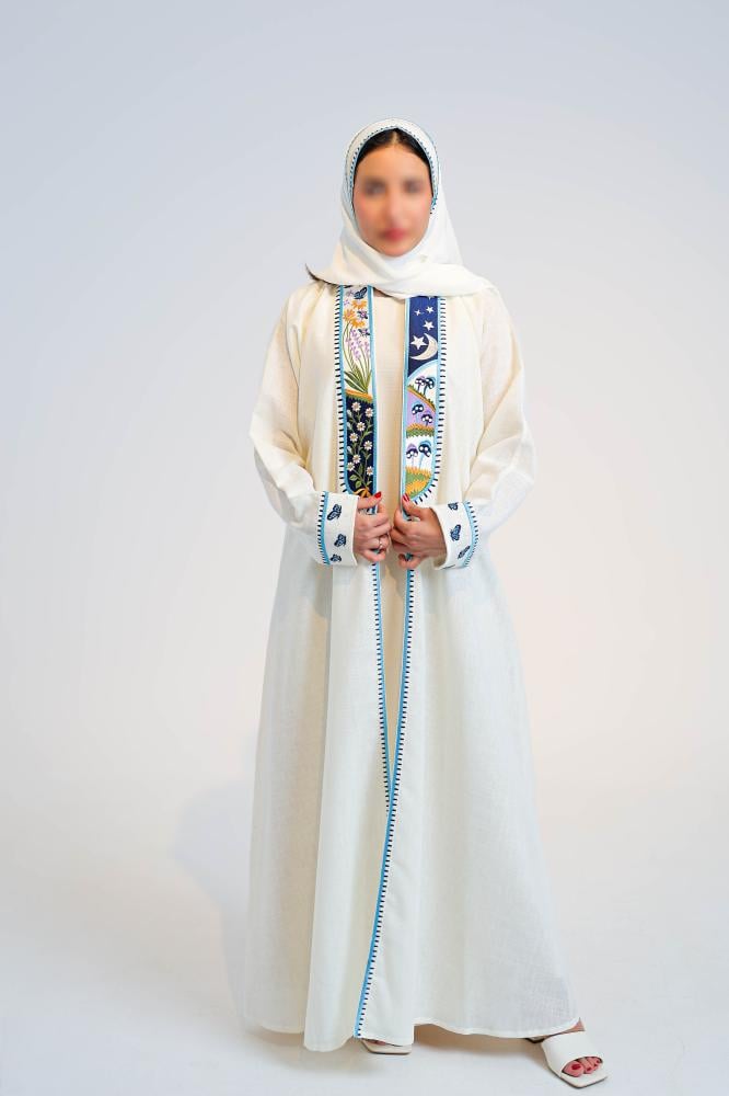 عباية مع فستان من اللنن مطرّز بتفاصيل ورد وفراشات